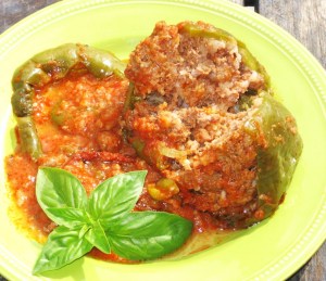 It was finally time to pick our green peppers today. We have been eyeing these green giants for the last two weeks waiting for them to reach peak size. Their purpose – Stuffed Green Peppers – was known already when they were first being transplanted in our raised garden bed back in June. This home-made meal was whole heartily consumed by all of us. We have satisfying memories of how delicious our green peppers were to both, grow and then consume.