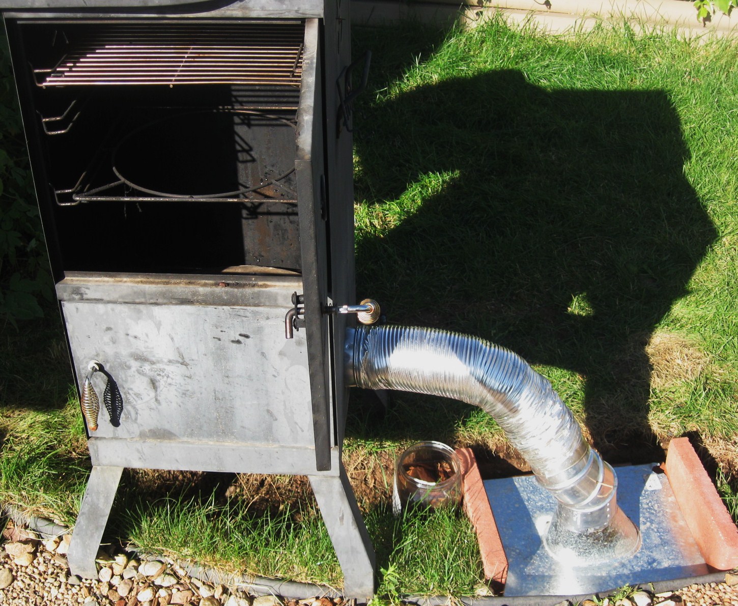 We converted our Hot-Smoker into a Cold-Smoker by cutting a 4 in. hole into the sidewall. We then dug a square hole (14 in. x 14 in.) two feet away from the sidewall. We lined the hole with concrete patio pavers (floor and walls). At the hardware store we purchased a 14 in. x 14 in. prefabricated sheet metal vent cover with a 4 in. diameter fitting. We then fitted the vent cover with a 3 ft. x 4 in. diameter piece of flexible duct. The opposite end is then secured through the hole in the smoker sidewall.