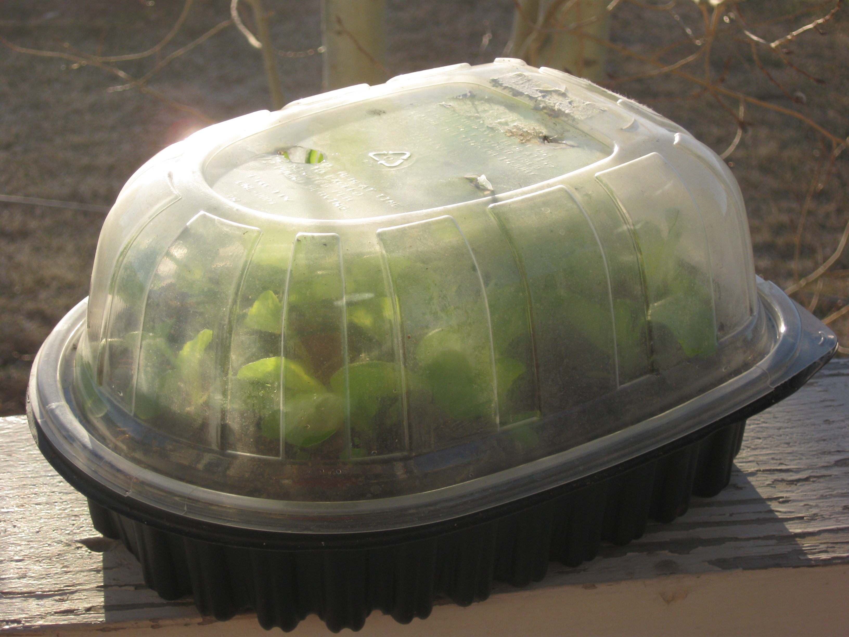 Place your salad containers in a sunny, warm spot keeping the soil moist (mist with plant food / water mix) . Placing the clear dome on the container will aid in increasing the soil temperature and humidity within the container which will increase seed germination and plant growth.