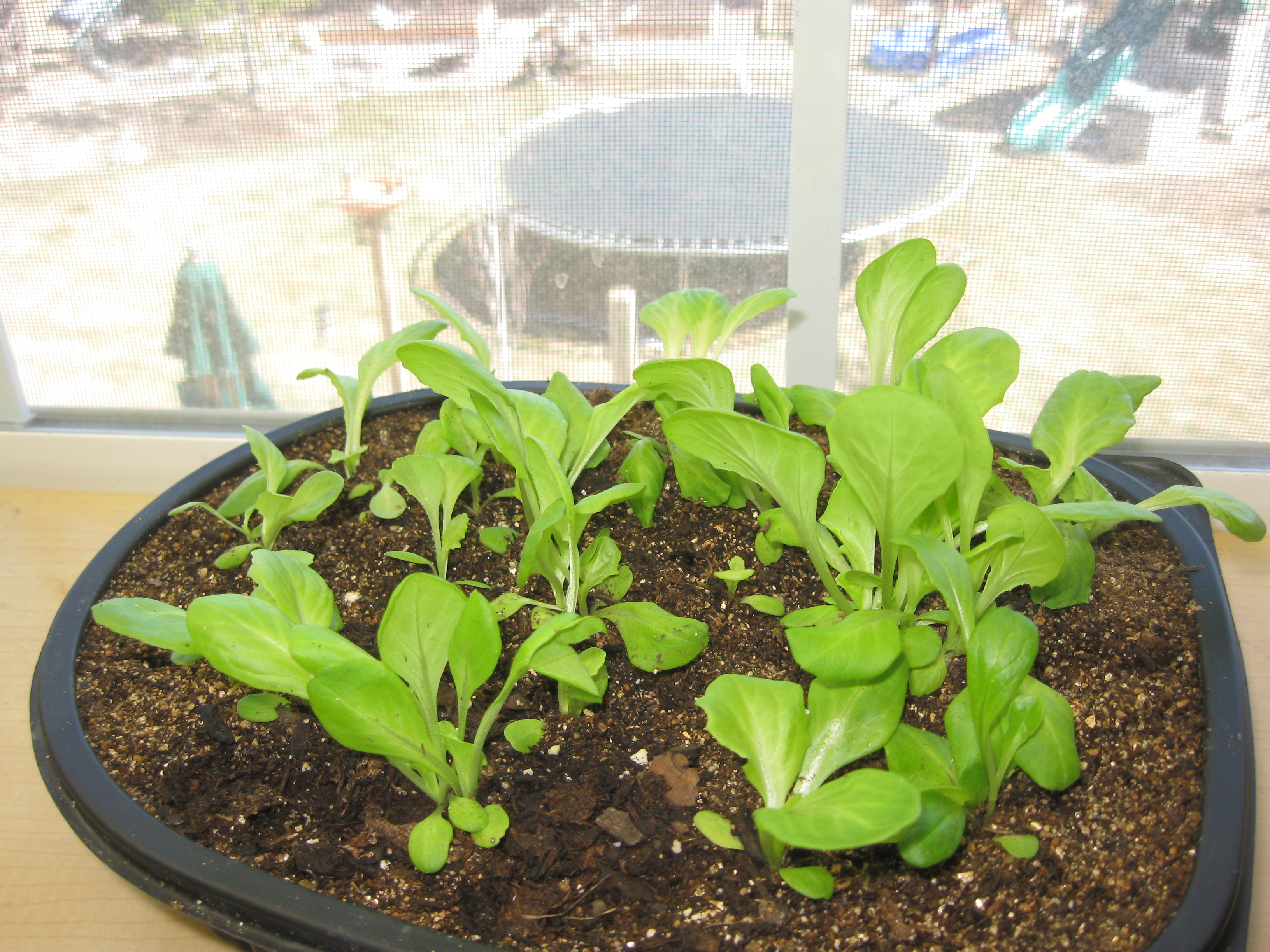 Lightly scatter your favorite leafy seeds (leaf lettuce, head lettuce, spinach, mesculah, etc.) Cover lightly with soil. Water from the top with a spray bottle (on mist) filled with a diluted organic plant food and water mix.