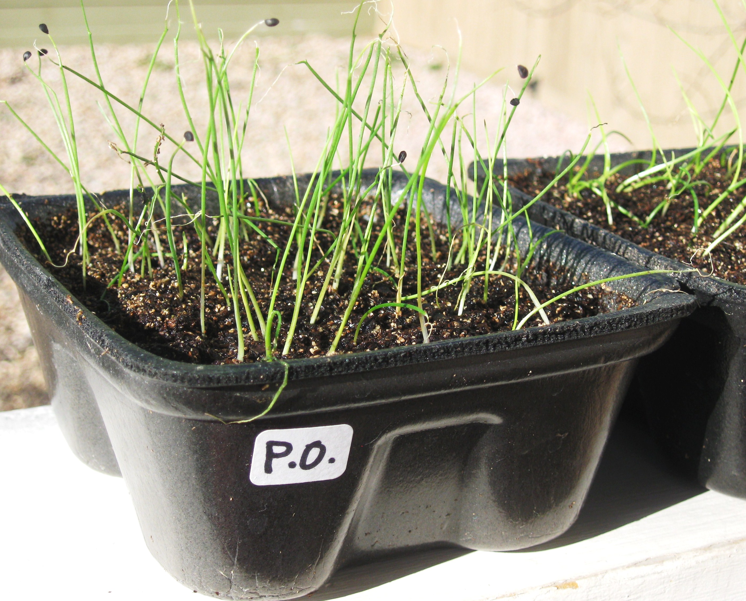 We recycle used 3 inch deep foam product trays.  These containers work well because they are the perfect size for a sunny windowsill. Simply poke a few holes through the bottom with a pencil for drainage then stack on top of another without holes for a drip pan. Next, fill the container 3/4 full with a seed starter plant mix. Within a 6 inch x 6 inch grid evenly plant approximately 50 onion seeds on top of the soil. Cover seeds with 1/8 inch soil. Spray soil (with mister) with a plant food/water mix until container begins to drain. Slide planter into a quart size plastic bag (do not close) and place on a sunny windowsill. Keep the soil moist removing the bag when seedlings emerge.