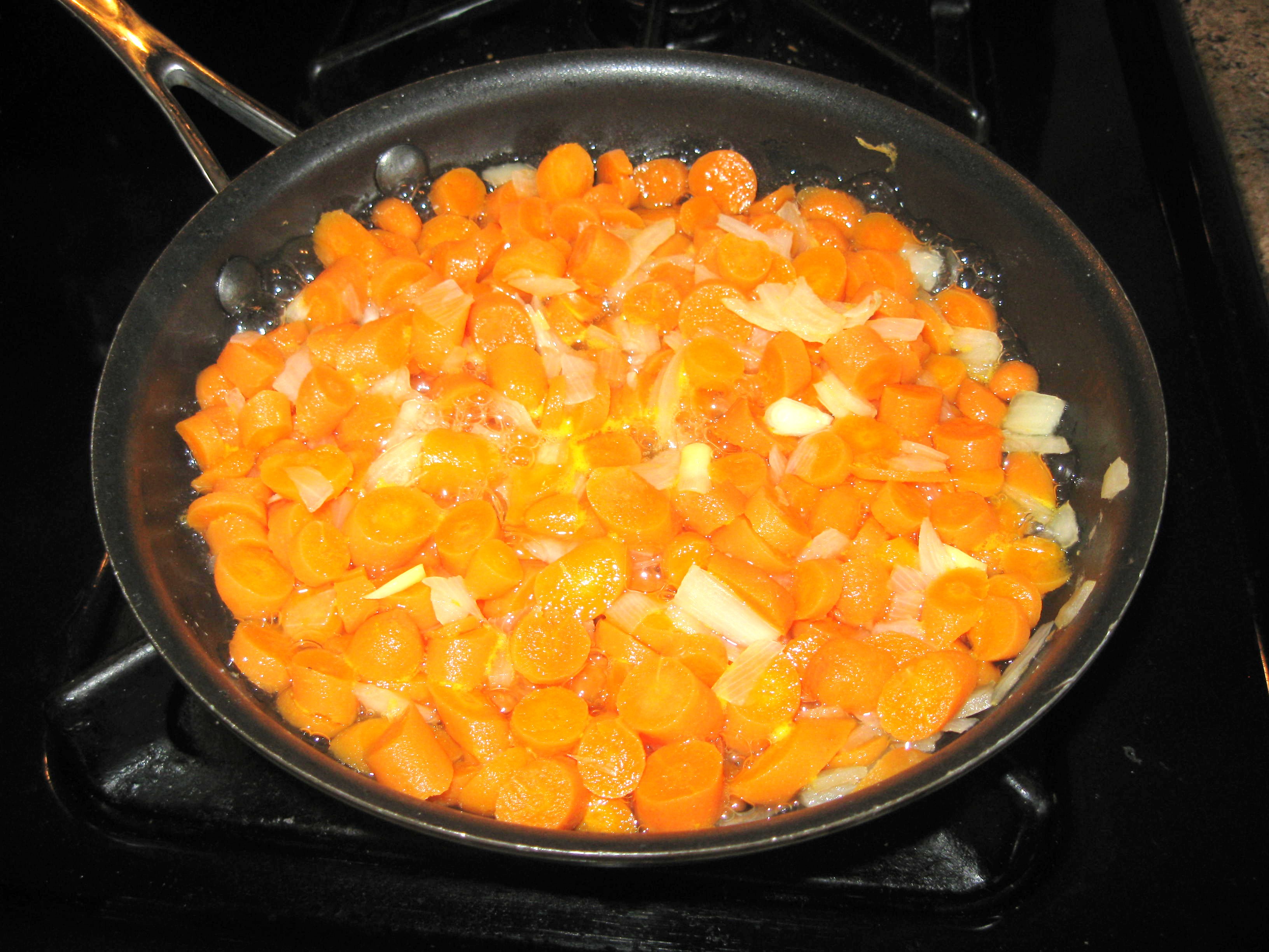 Prep: In a medium sauce pan bring water to a boil. Add carrots and onions and simmer on low heat . Stirring occasionally, simmer until all moisture is removed and carrots begin to sizzle (20-30 minutes). Add butter, stir and simmer for 2-3 minutes. Garnish with fresh chives and serve. These are also wonderful chilled and served in a pasta salad.