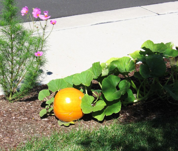 Our HOA Codes state: Gardens in the front yard are Not permitted (silly rule). To successfully keep our front yard garden hidden we simply went incognito. We integrated our veggies to fit in with the rest of the surrounding landscape. Along the edges we cut out the water-thirsty grass. The sod pieces were piled upside down and topped with rich compost and garden soil to build berms. The decomposing sod retains water, adds nutrients to the soil and saves on our soil needs. We planted annual flowers, small shrubs and rose bushes on the berms offering medium plant height. Mulch was added and vegetables were planted. In the fringes we planted groupings of onions, swiss chard, lettuce, spinach and carrots. Both summer and winter squash were planted as groundcover to cover the berms. The neighborhood kids loved watching our curb-side pumpkins grow bigger each day.
