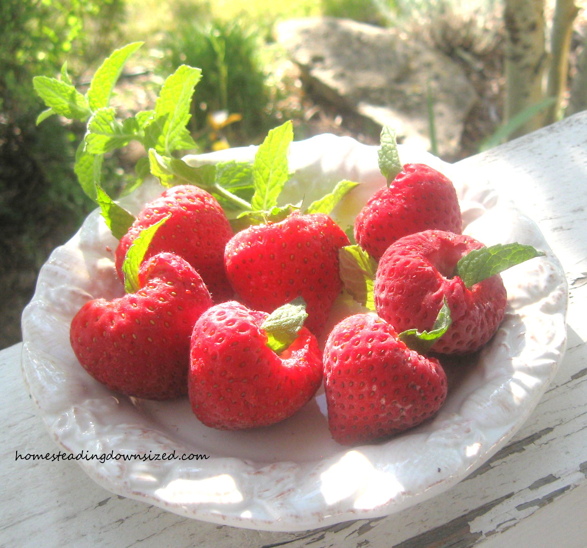 The summer heat has begun and our strawberries are ripening  quickly.  When we have to pick them faster than we can eat them it’s time for our favorite frozen treat – Strawberry Mint Bombs.