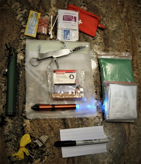 My survival day pack weighs only 7 ounces and is contained within a waterproof pouch that easily fits into my jacket pocket. The contents include the following.