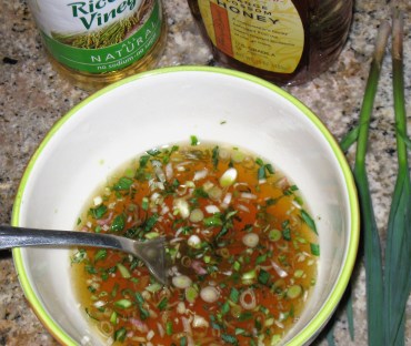 Place diced garlic into a small bowl and add equal parts rice vinegar and honey. Stir combination together until the honey is dissolved and it is well mixed.
