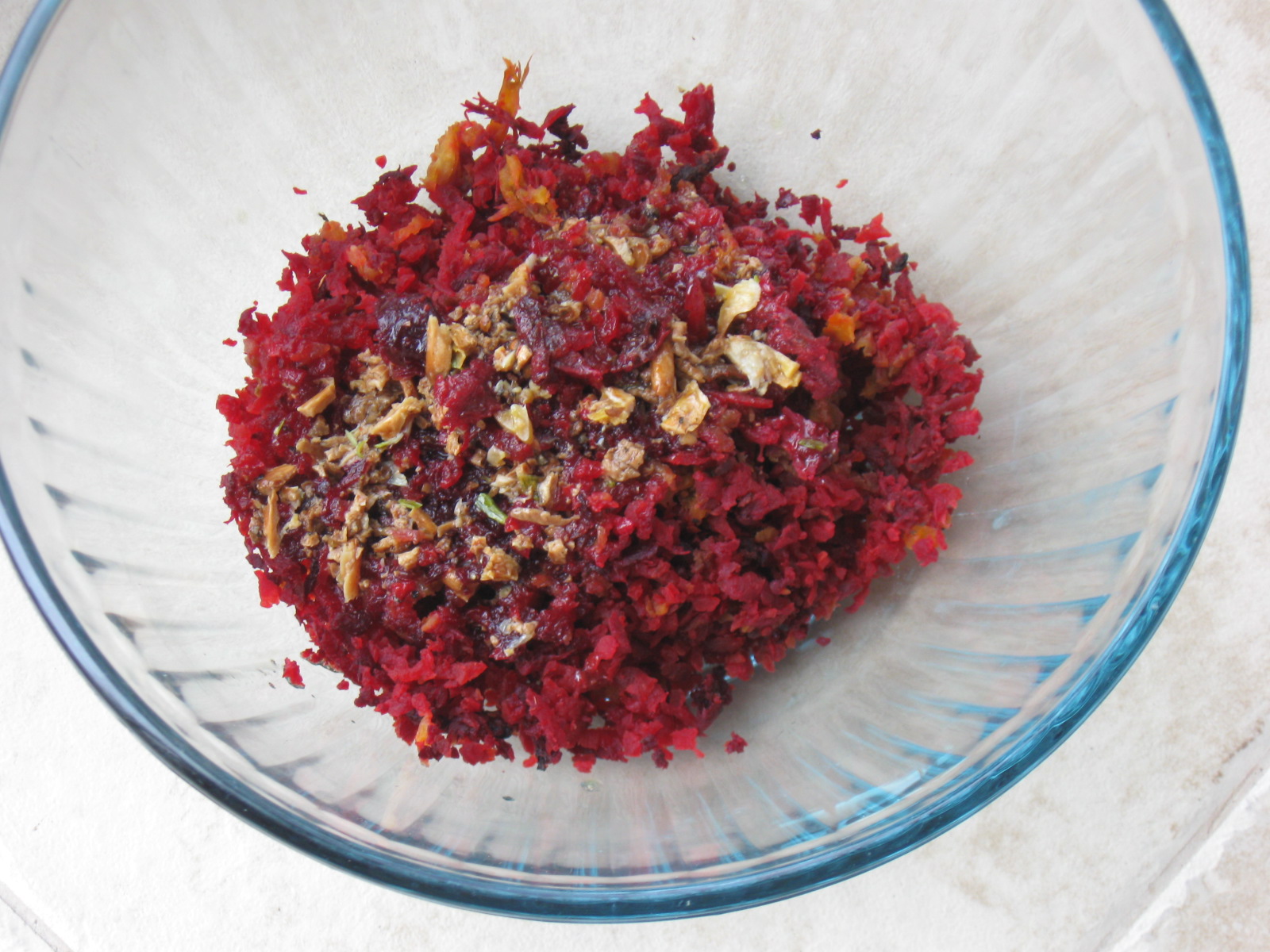 Let cool then peel beets with edge of a knife. Once beets are peeled, grate each section through a coarse grater and place in a bowl.